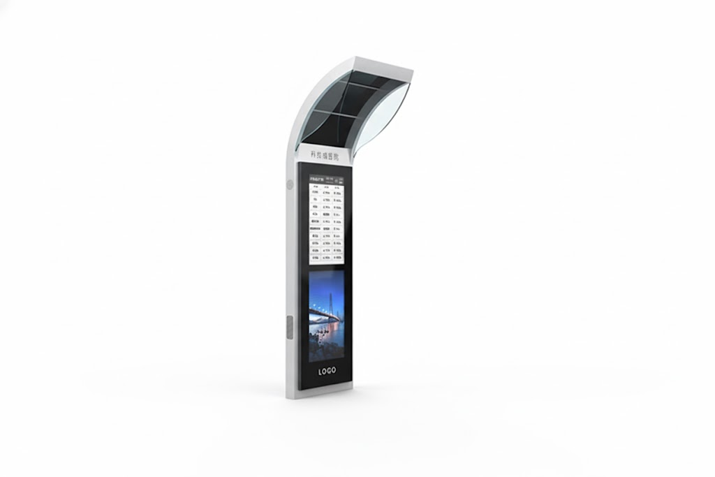 外观采用‌极简未来风‌,哑光磨砂质感搭配撞色饰条,科技感与艺术感兼具;搭载高亮防眩光触控屏,适配全时段户外使用;内置高性能处理器与5G通信模块,保障数据传输与系统响应速度;支持太阳能+市电双供电,兼具环保性与稳定性;通过IP65防护等级认证,抗风、防尘、防水,适配复杂户外环境。